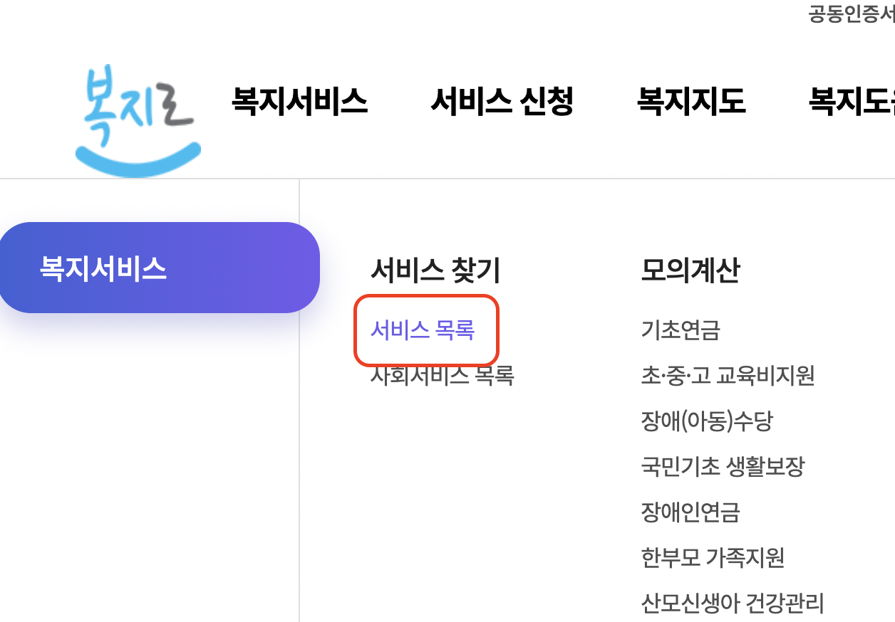 - 상단의 메뉴바에서 [복지서비스 > 서비스 목록] 클릭