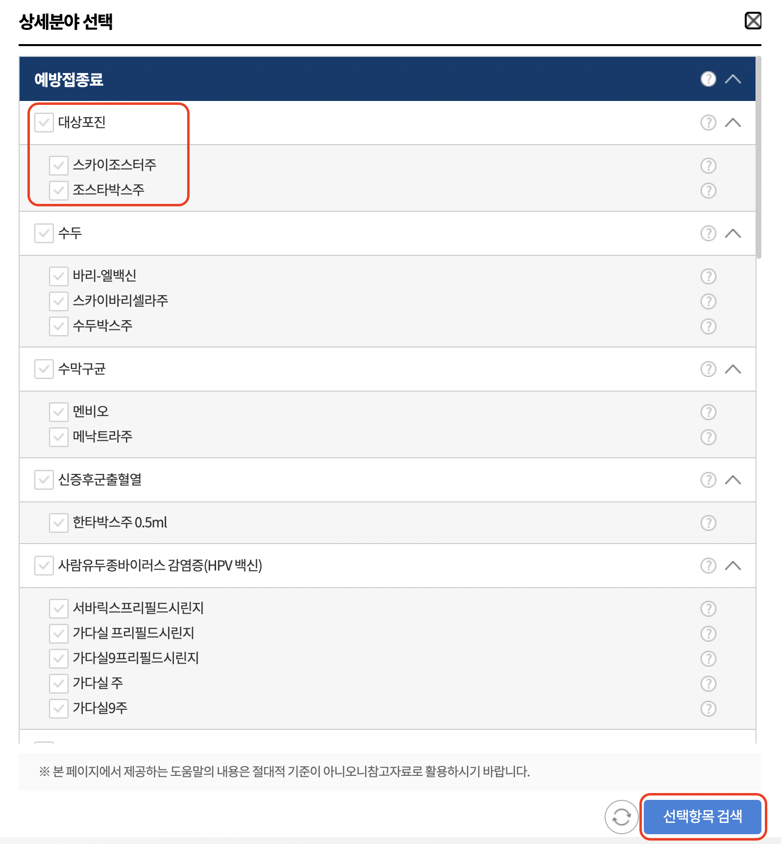 - 여러 종류의 예방접종 중 [대상포진] 선택