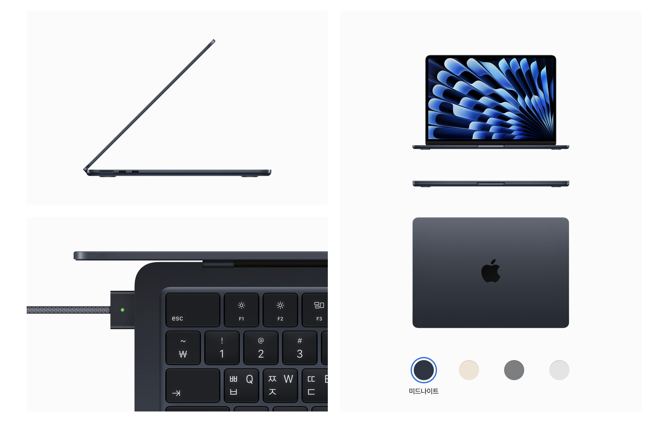 멕북 에어 15 디자인을 보았을 때 우선 15.3인치라는 크기가 가장 유저들이 기대했던 사이즈였으며, 디스플레이는 Liquid Retina로 13 시리즈와 동일합니다. 그리고 최강의 얇기를 보여줄 것이기에 휴대하기도 더 편리해졌다는 장점이 있고, 색상은 가장 대중적인 미드나이트, 스타라이트, 스페이스그레이, 실버 등 총 네 가지 색상으로 출시되었습니다.