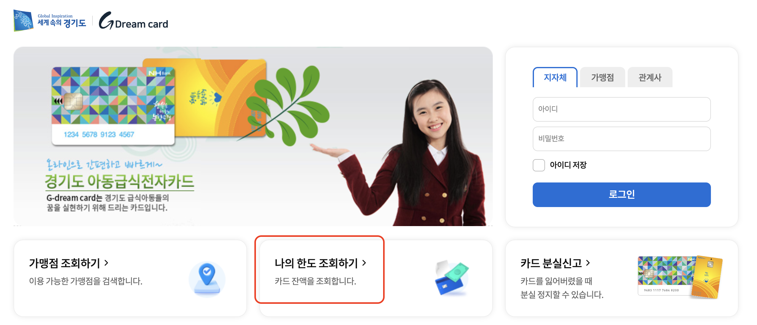 예시로 경기 지역의 G드림 카드 홈페이지를 보시면, 첫 화면에 [나의 한도 조회하기] 버튼을 누르면 카드번호를 적으면 아동급식카드 잔액 조회가 가능합니다.