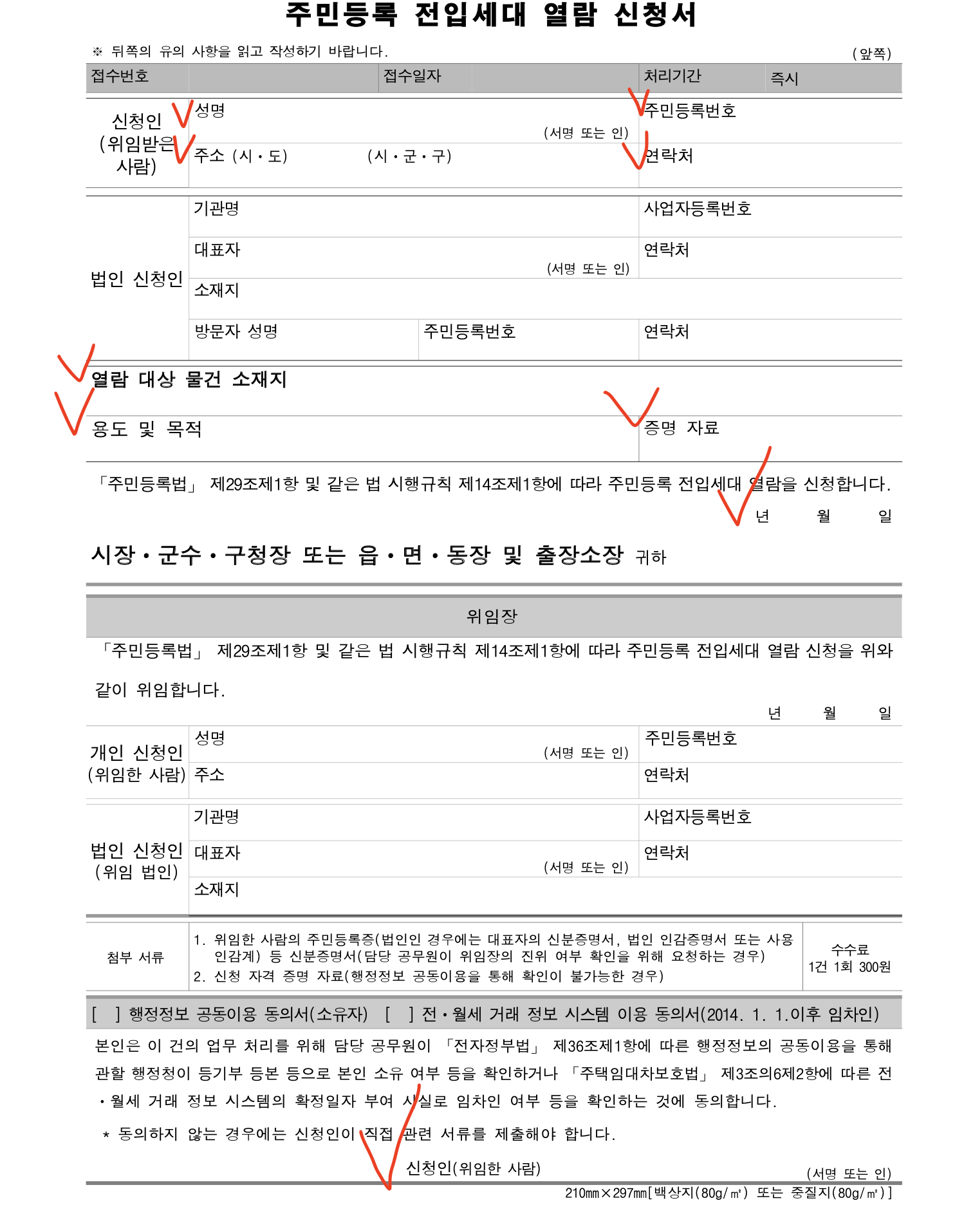 - 신청인 성명, 주소, 주민번호, 연락처