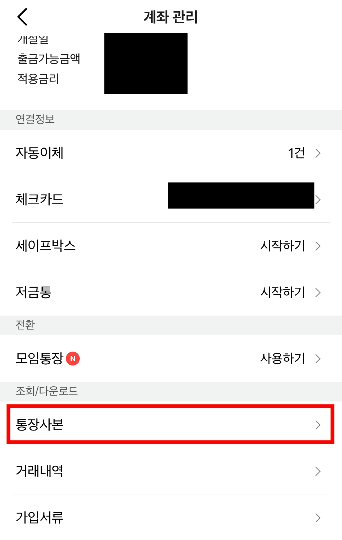 설정 안으로 들어오면 계좌 관리에 관련한 다양한 메뉴들이 있고 그중 아래 쪽에 '조회/다운로드' 영역에 보이는 [통장사본] 메뉴를 클릭해 줍니다. 계좌가 언제 개설되었는지 확인할 수 있는 사본 이미지가 보이고 하단에 '저장하기'를 누르면 png 이미지 파일로 저장이 됩니다.