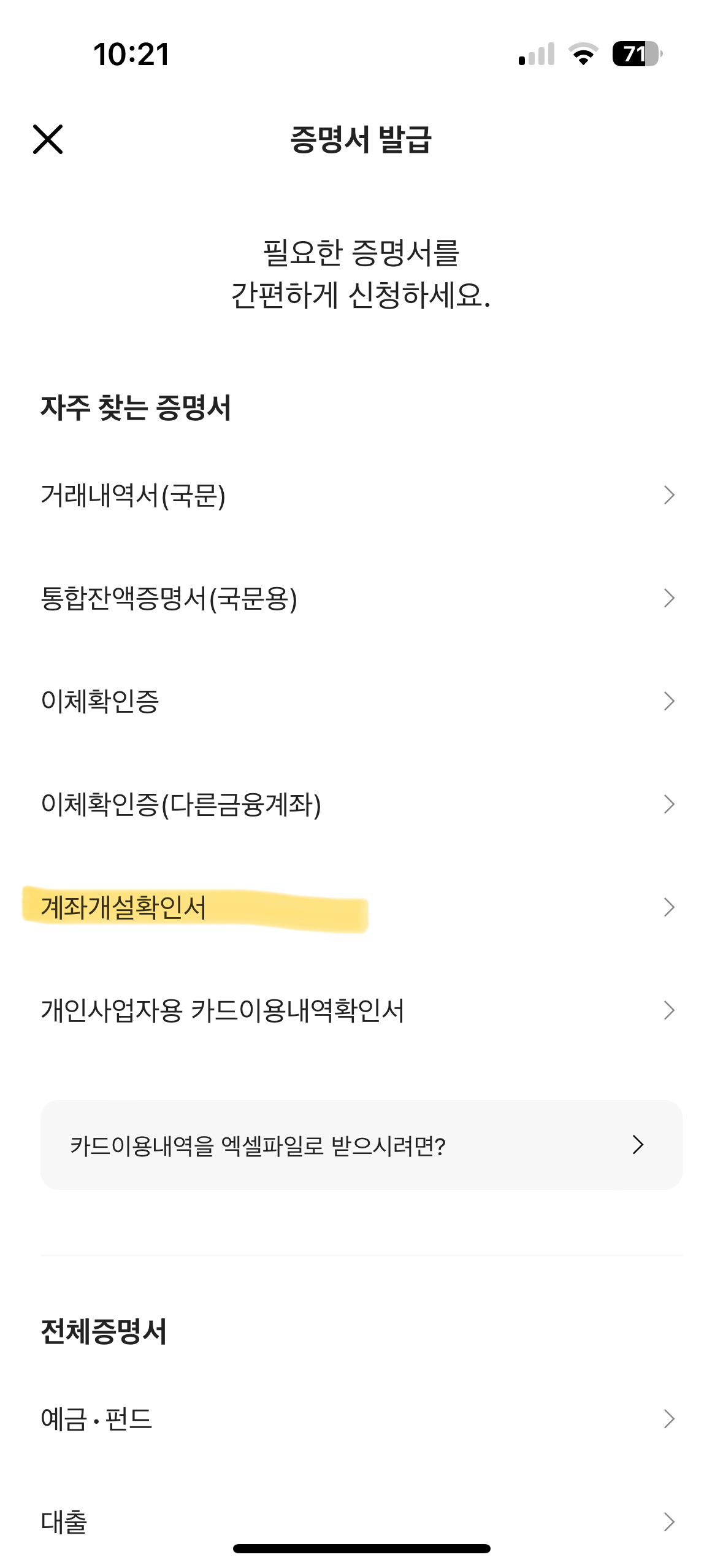 - 발급할 수 있는 증명서 중에 '계좌개설확인서' 항목을 클릭합니다. 그 외에 원하시는 증명서가 있다면 해당 업무를 클릭해도 됩니다.