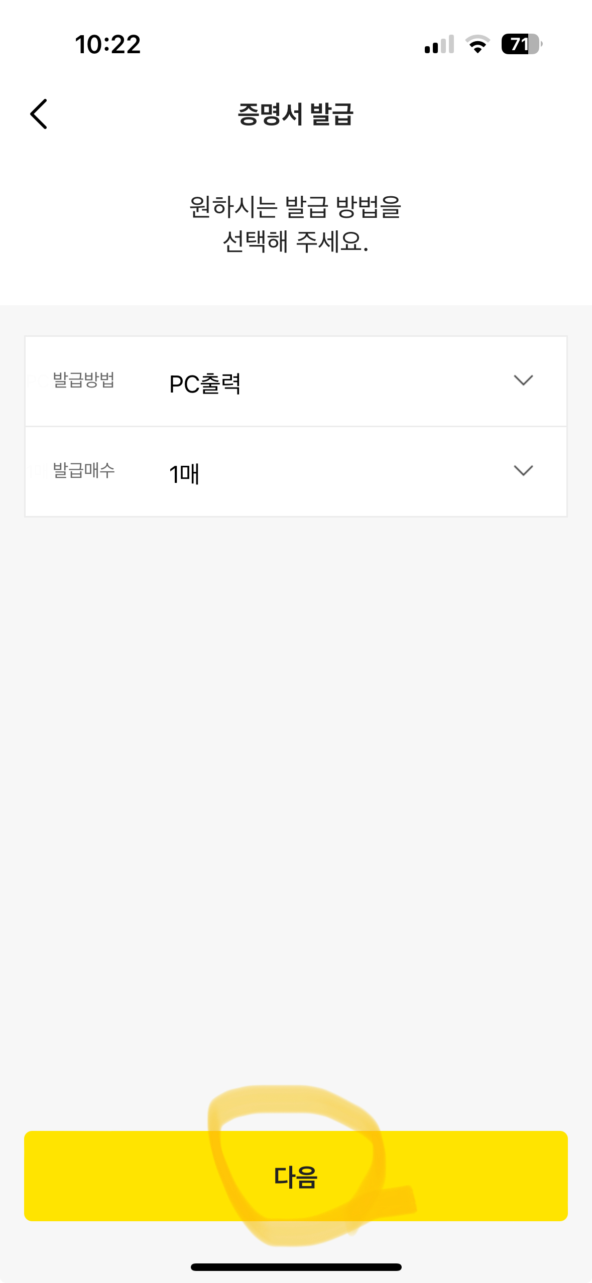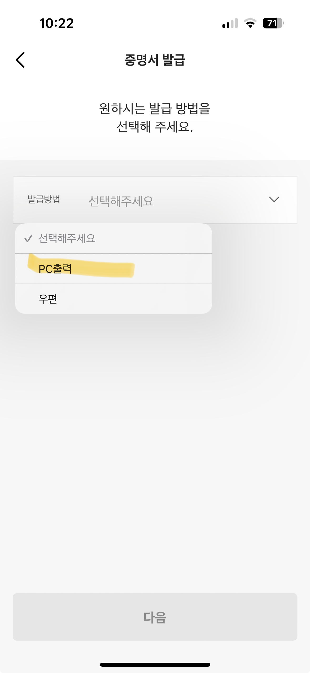 • 원하는 출력 방식을 선택할 수 있는데 PC출력과 우편 2개만 지원됩니다. 대부분 pc로 진행합니다.