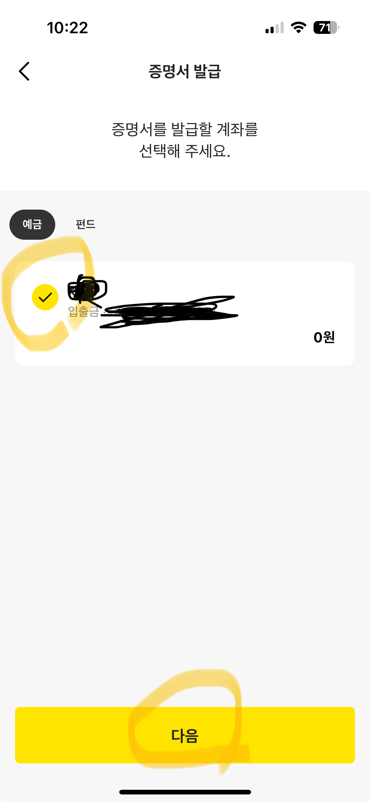 • 선택이 완료되었으면 증명서를 발급한 계좌를 선택한 후 신청을 완료하면 PC 화면에서 이어서 출력이 가능합니다.
