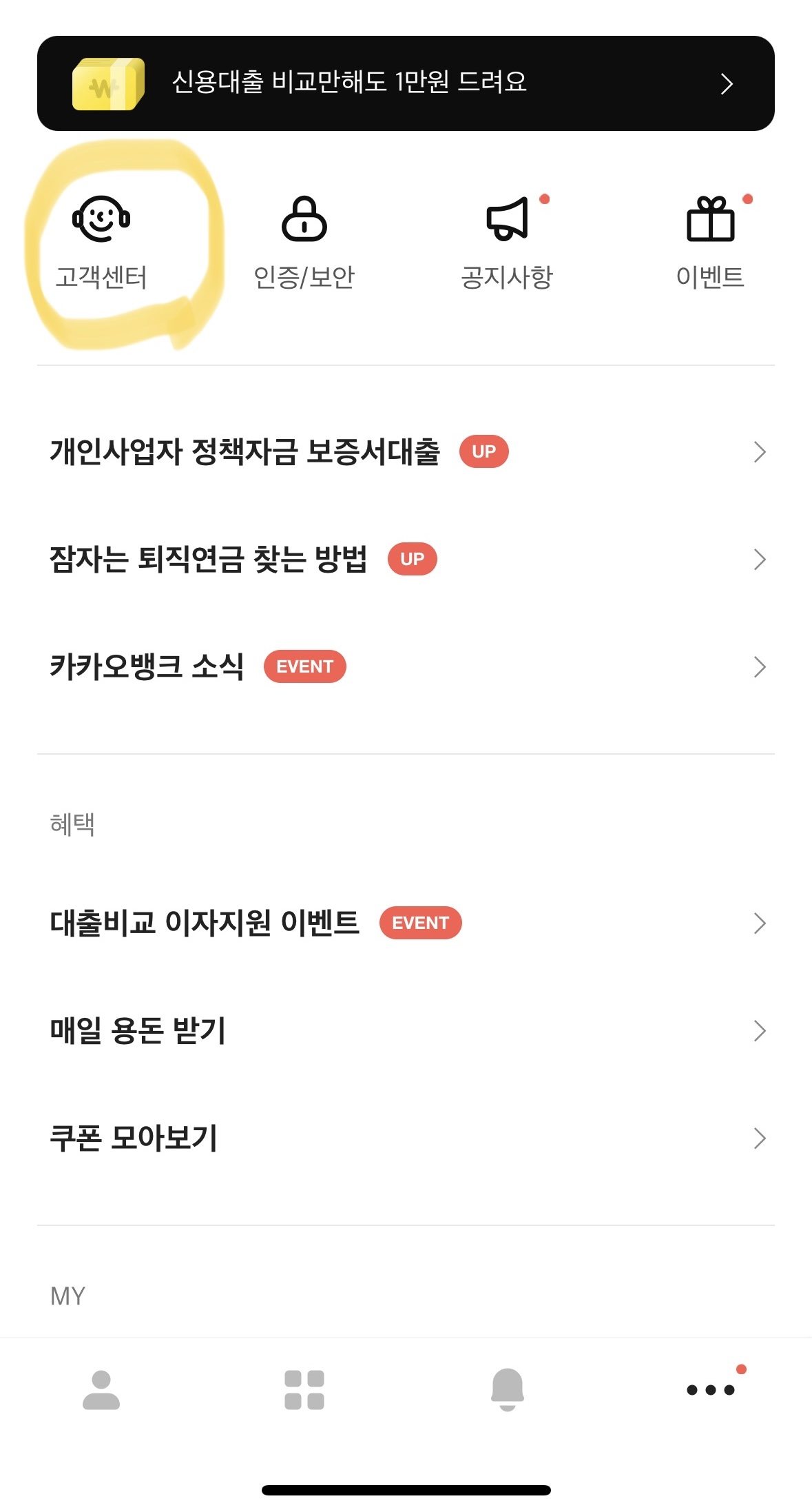 • 카카오뱅크 앱 홈화면 하단에 보이는 점 3개 아이콘을 클릭해 줍니다.