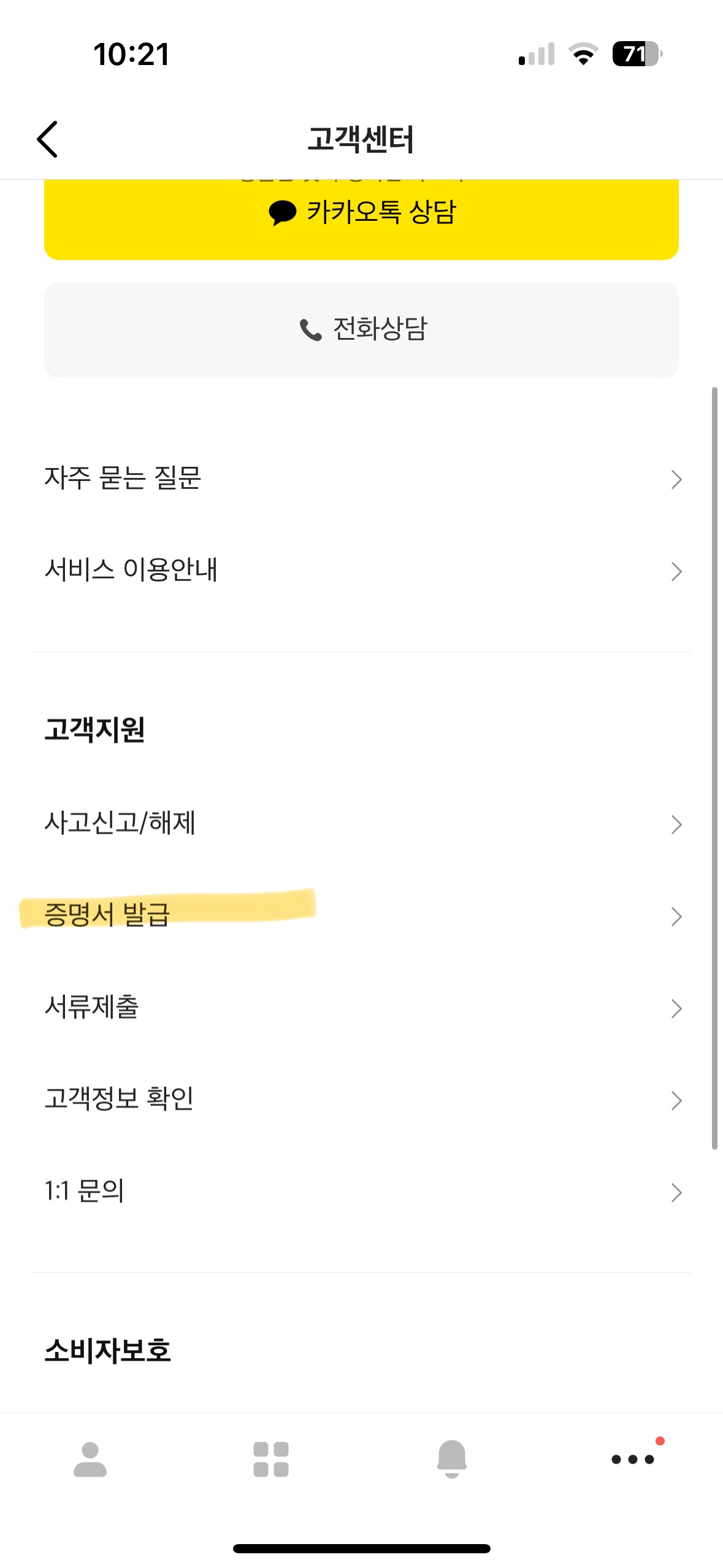 - 스크롤을 내리면 보이는 [고객지원 > 증명서 발급] 경로로 이동합니다.