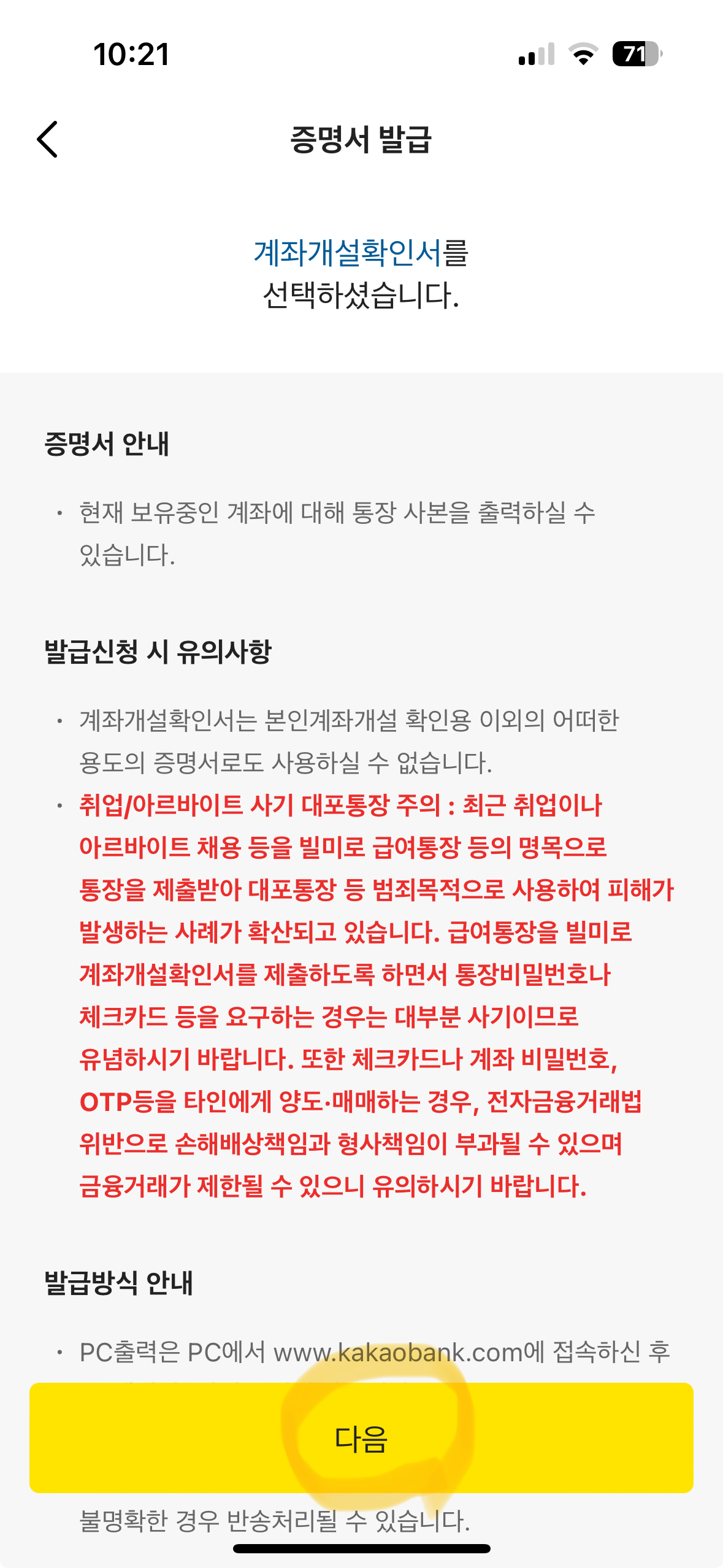 • 증명서 안내 및 주의사항을 꼼꼼하게 읽은 뒤 '다음'을 누릅니다.