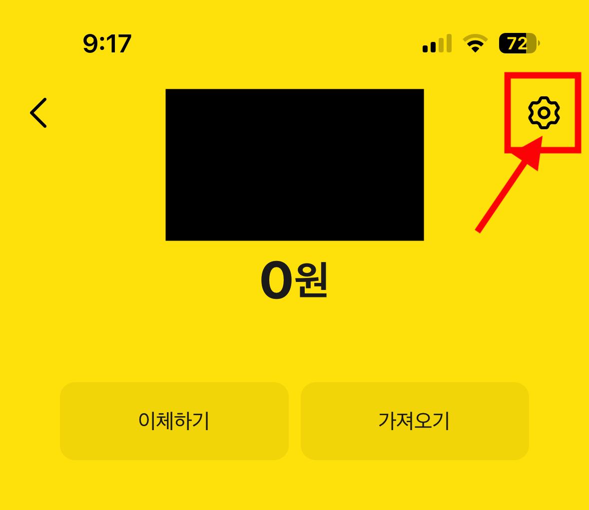 카카오뱅크 앱 설치 후 로그인이 완료되었다면, 홈 화면에 보이는 자신의 통장 영역을 클릭해 줍니다. 그러면 자세한 이체 내역과 함께 우측 상단에 '톱니바퀴' 아이콘이 보이는데요. 설정 항목으로 들어가는 것이니 클릭해 줍니다.