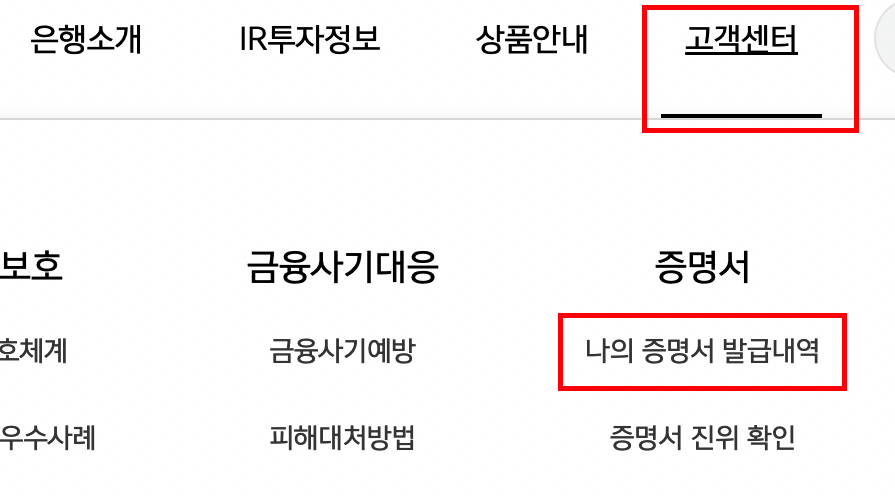 • 카뱅 홈페이지 메뉴 중 [고객센터 > 증명서 > 나의 증명서 발급내역]으로 이동합니다.